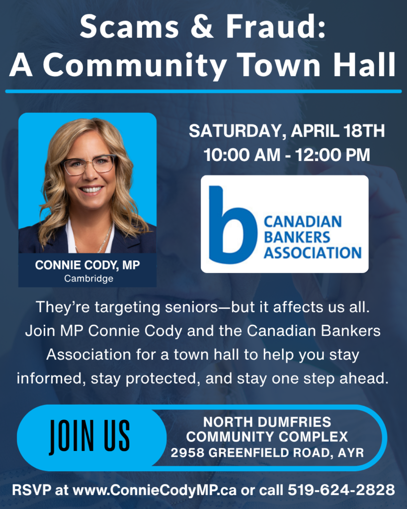 Scams and fraud are on the rise, and seniors are often the primary targets. Join MP Connie Cody and the Canadian Bankers Association for an informative community town hall focused on how to recognize scams, protect your finances, and stay one step ahead of fraudsters. This session will provide practical tips, real world examples, and an opportunity to ask questions.